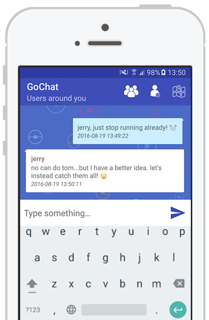 Location based discovery of PokémonGO players near you, enabling you to chat with anybody that is using the GoChat app in your defined range.